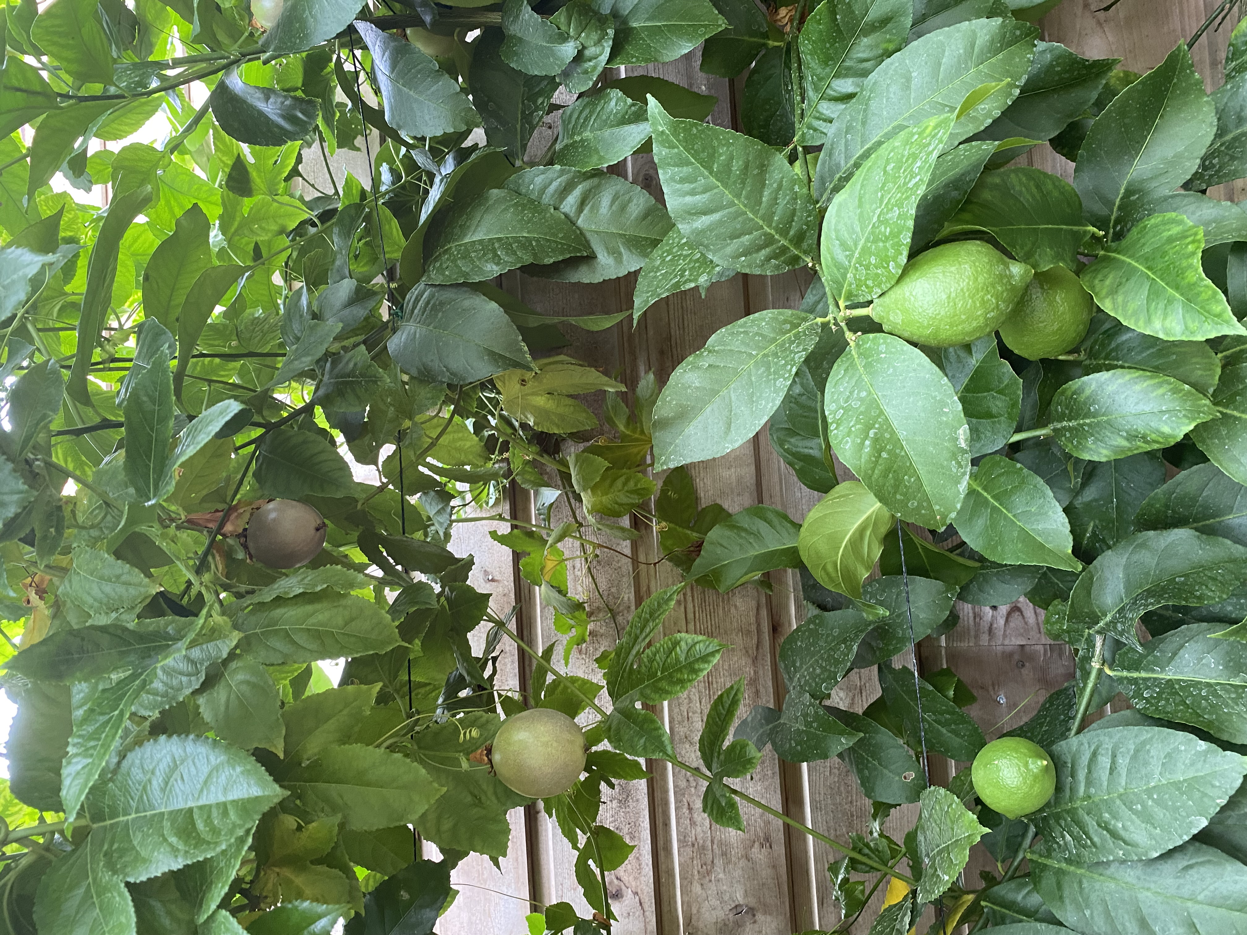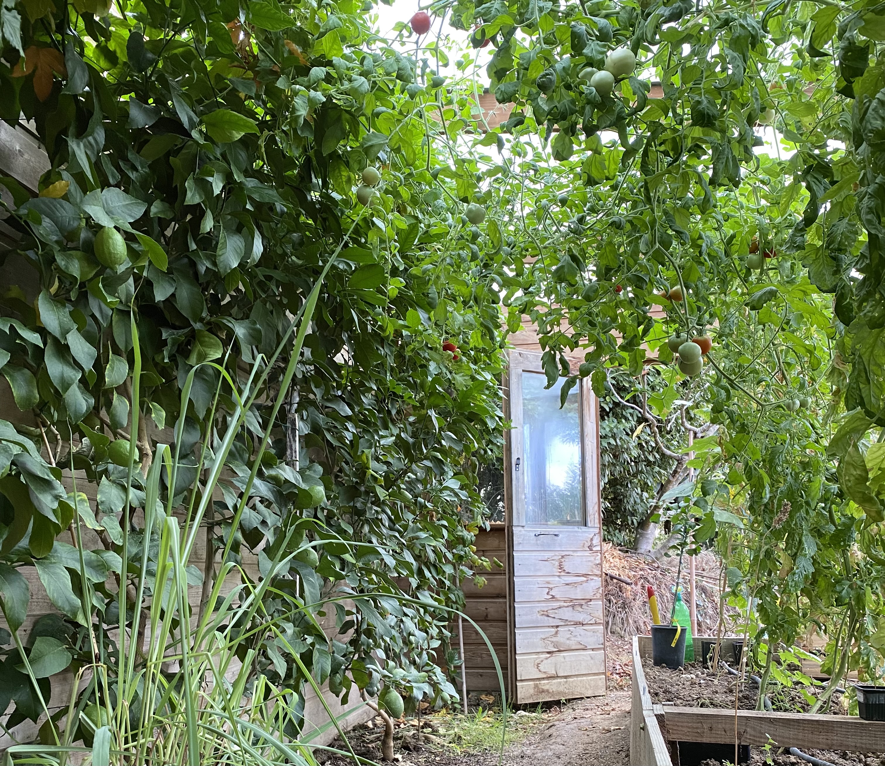 Dans la serre (region toulousaine), citronniers, passiflore edulis (frederick) et tomates cohabitent.