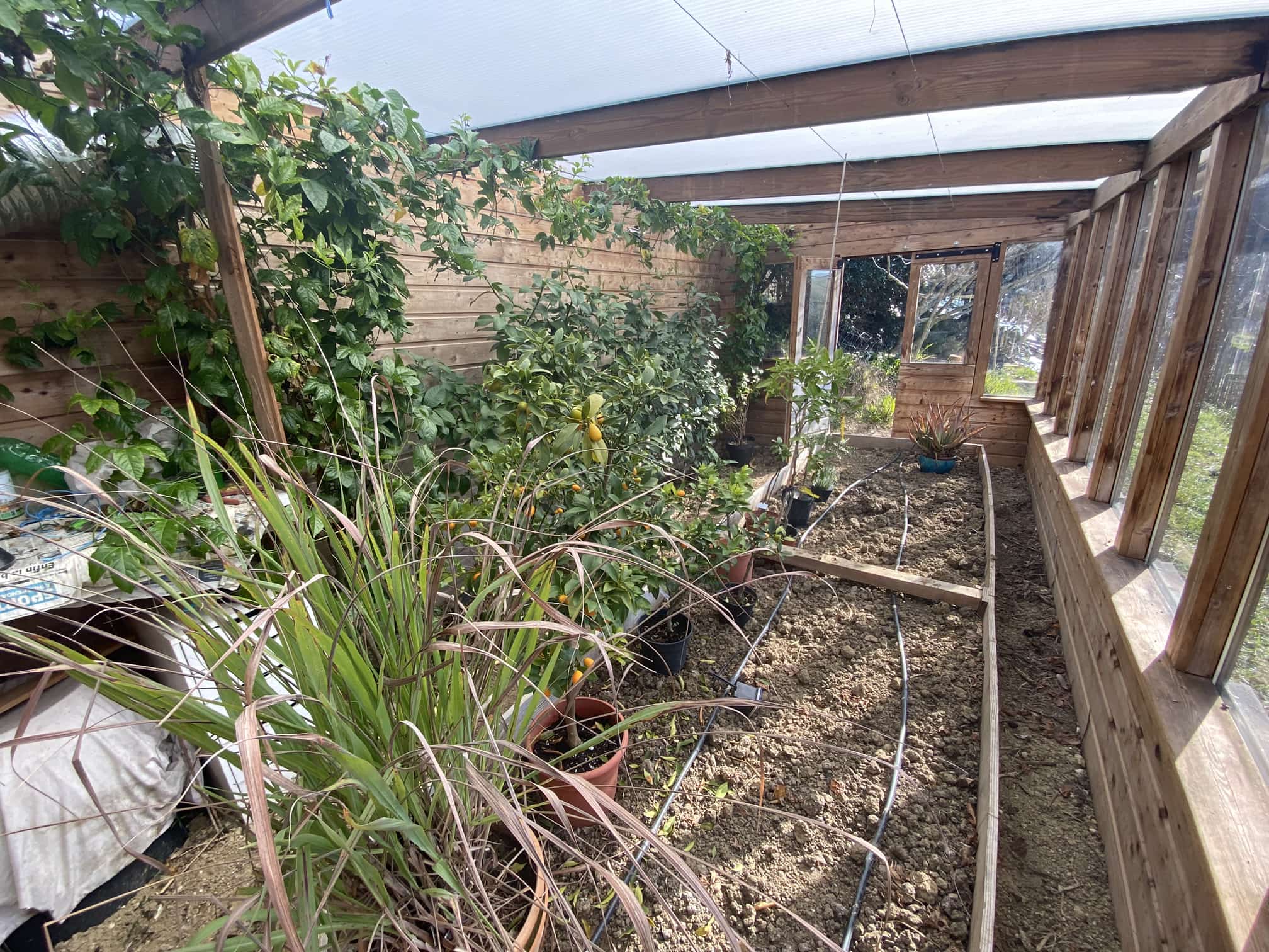 Voici ma première serre : potager, citronniers en palmette et passiflora edulis. Elle me sert aussi pour hiverner.