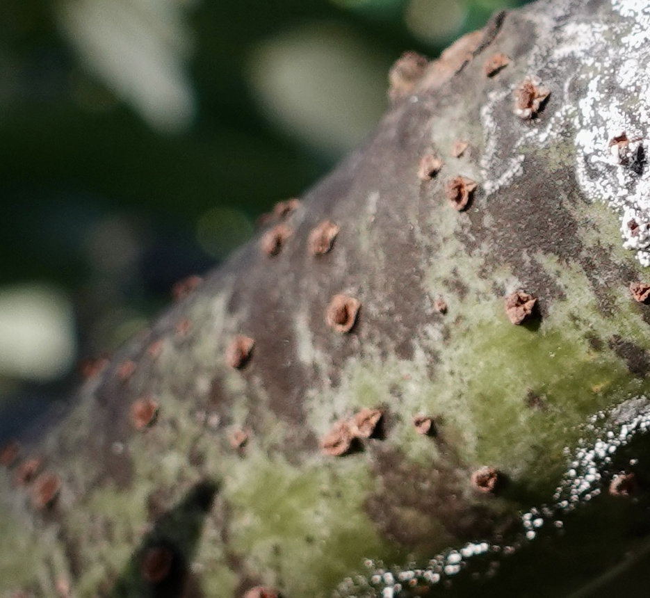 Voilà 9 ans que poussent des avocatiers pour 95% d'entre eux de semis en emplacement direct à 4 km de la mer dans les Pyrénées Orientales à Latour bas Elne. Ils ont commencé à fructifier il y a 4 ans et chaque année il y a plus de production et plus de variétés. Le soucis est que depuis cet été 2023 sont apparues des taches blanches épaisses sur les branches de toutes tailles, plus nombreuses dans le tiers inférieur des arbres et ce sur presque tous les avocatiers (plusieurs dizaines d'arbres). Les branches deviennent cassantes, les feuilles de bout de branches sèchent, et à la coupe le bois n'est plus beige clair mais taché de brun. J'aimerai avoir votre avis sur la question. J'ai exposé la situation sur un groupe Facebook dédié aux avocatiers. Un des membres pense qu'il s'agit d'une combinaison entre un insecte et un champignon. Le champignon profite des blessures causées par l'insecte pour coloniser l'arbre. Les dépôts blancs seraient de la sève qui se serait cristallisée après être sortie des blessures. Cela semble être confirmé par son goût sucré.