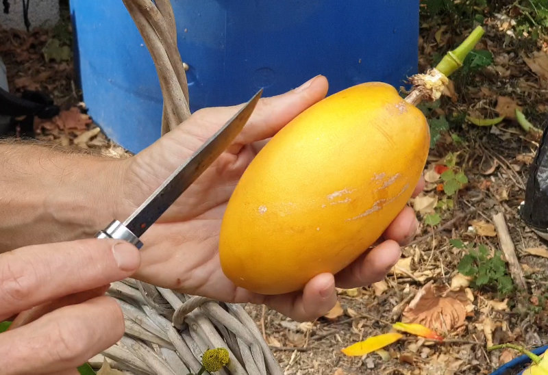 Ce n’est pas tous les jours qu’une barbadine mûrit dans le Gard (c’est à ma connaissance une première !). La saveur de la pulpe ressemble à celle de la grenadille (Passiflora liguralis), elle est toutefois plus aromatisée. La peau (albedo ?) peut se manger, ça rappelle le melon.