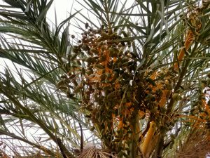 Il s’y trouve sans grand étonnement des dattiers ça et là qui produisent bien mais ils sont très hauts. L’un d’eux a des fruits rouges.