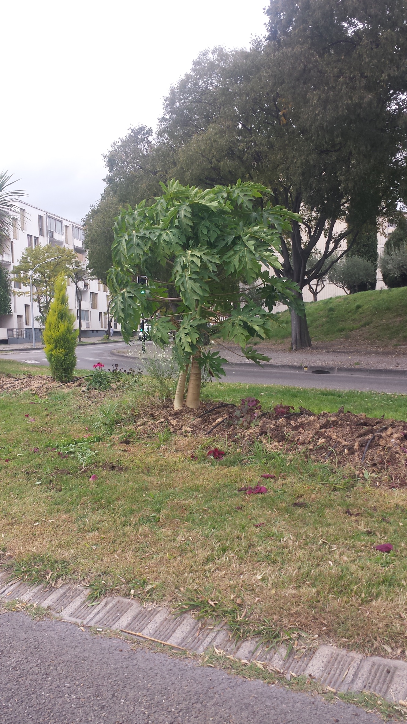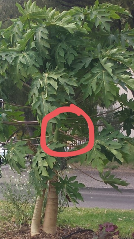 Voici un papayer qui était sur Nîmes avenue Georges Dayan fin octobre 2019, en regardant bien on peut apercevoir un fruit.