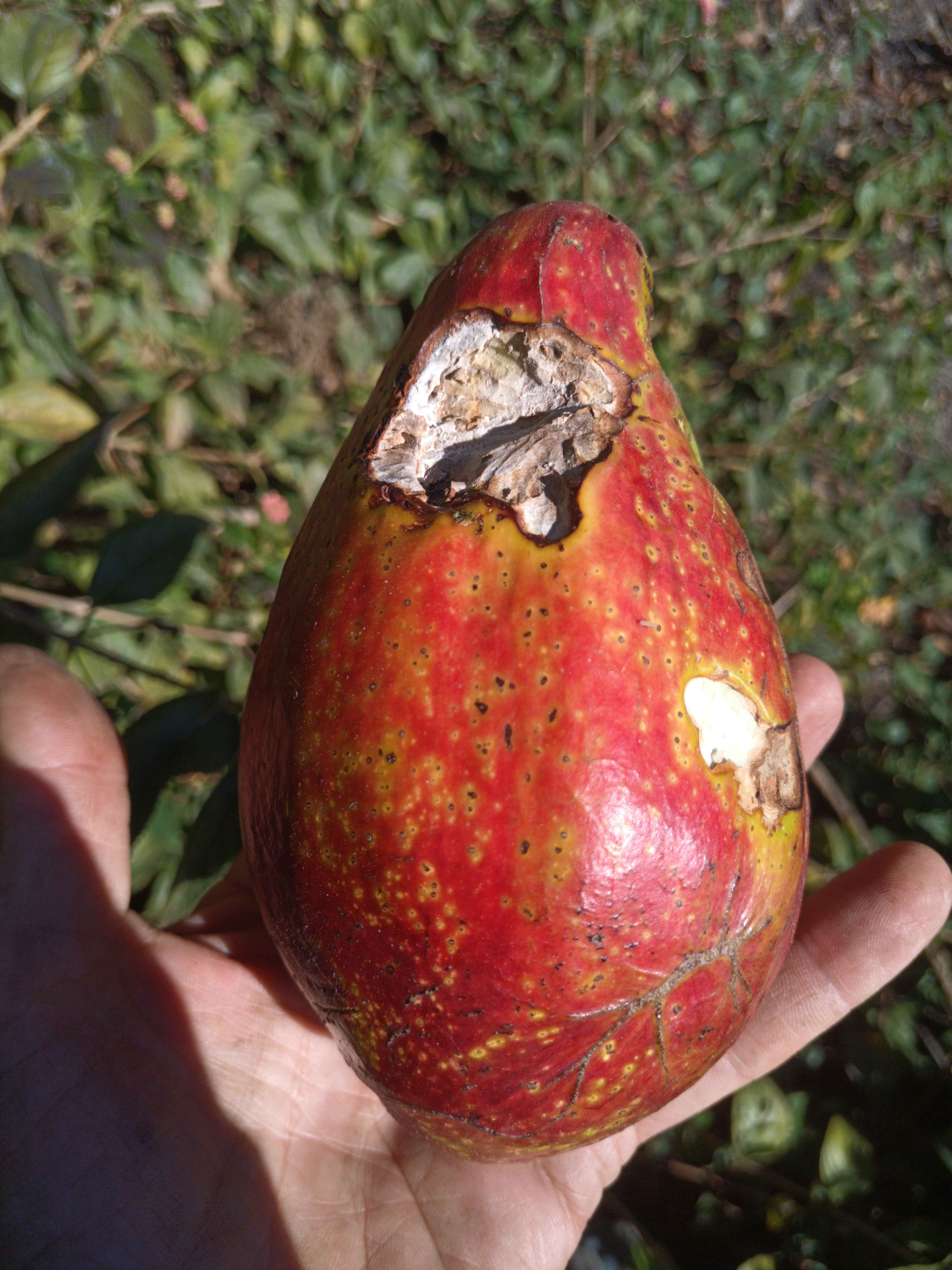 Pardon j'ai publié davantage de photos après ta réponse, tu vois ce n'est pas un fruit commercial, il a des irrégularités un noyau énorme et un fruit lui même énorme