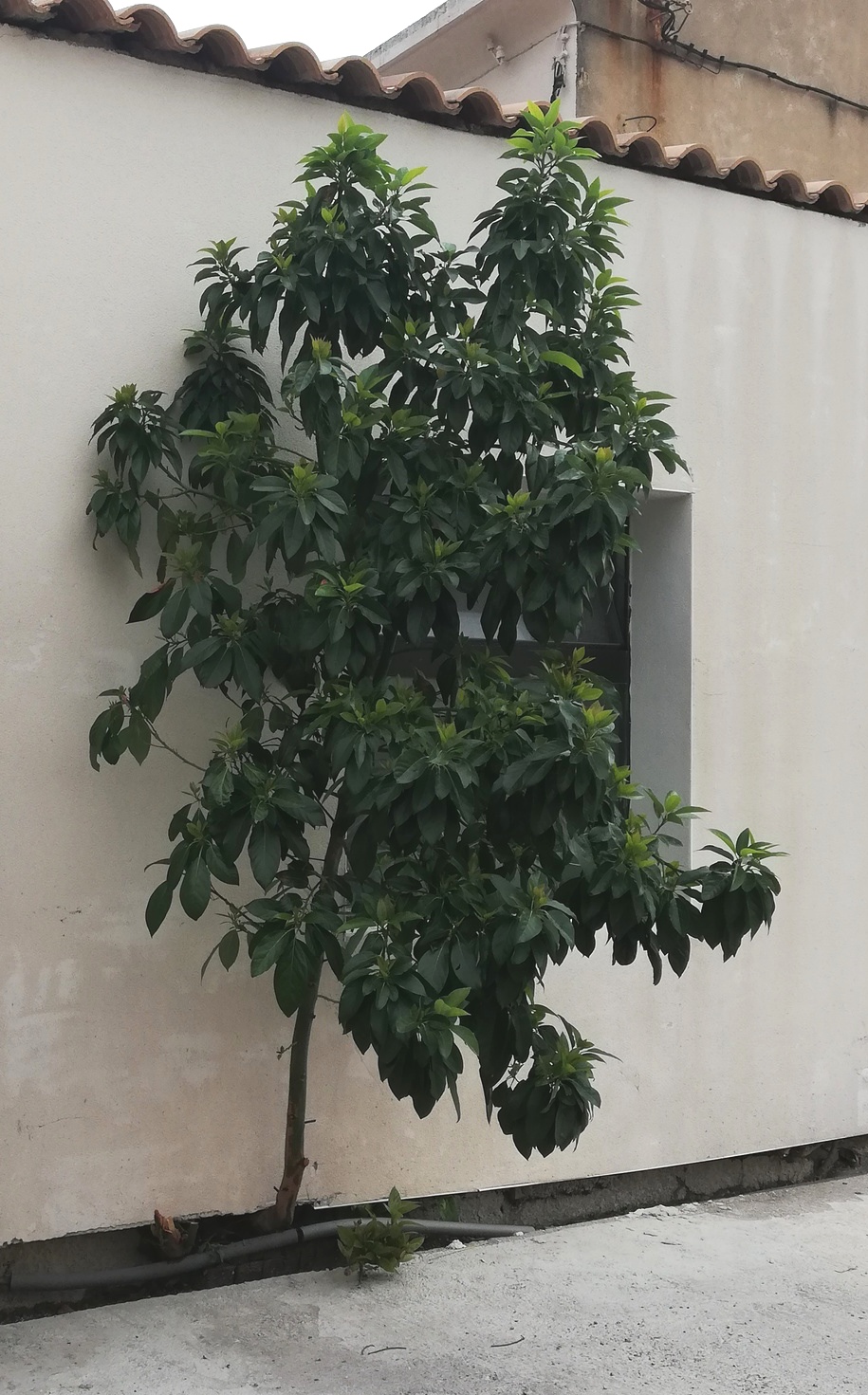 Voici un cliché d'un avocatier qui pousse dans un mur ! Il s'agit d'un avocatier fuerte qui produit de très bons fruits. L'arbre est régulièrement coupé par son propriétaire, mais depuis dix ans que je l'observe il fait de superbes rejets.