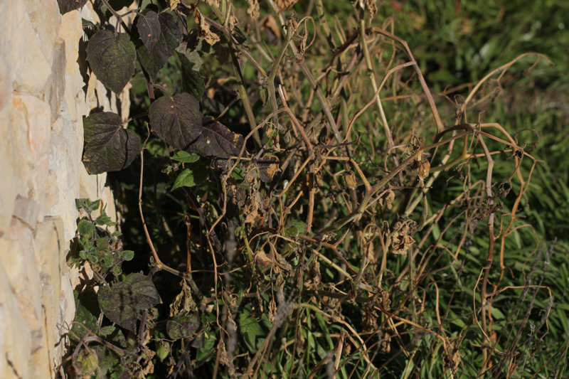 Les physalis sont de véritables thermomètres. On voit que contre le mur il y a eu un léger gel (feuilles brunes) tandis que l'on s'éloigne ont constate un gradient de dégâts allant de feuilles fanées à des branches brulées par un gel d'au moins -3°C/-4°C.