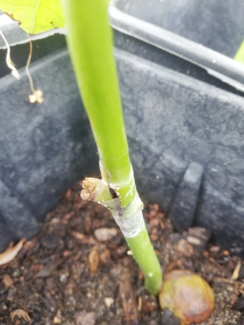 - "Mexicola 5" trois bourgeons greffés en chip budding, l'un d'entre eux semble sec, les deux autres sont verts et ils sont dans ma serre.
