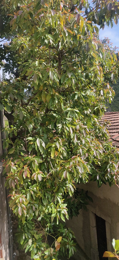 L'avocatier n°1 , haut + de 6m et large + de 8M, a des feuilles légèrement anisées et des fruits à peau lisse. était planté "il y a 40 ans". Par Madame, qui s'amusait avec des allumettes à faire germer des graines du commerce, d'origine israel pense-t-elle. puis elle les mettait en pots sur sa terrasse, les laissait dehors en hiver, certains mourraient. Elle a planté un survivant dans un jardinet, ancien poulailler, très proche (50 cm) d'un mur en pierres qui retient toute la terre surplombant une ruelle. ce mur n'a pas été détruit par la pousse des racines. il est bien protégé entre 2 maisons et une chaufferie. il y a quelques années, seules les extrémités des branches les plus hautes ont peu grillé (sur une longueur de 30 à 50 cm, on les voit encore). et il continue à bien pousser.