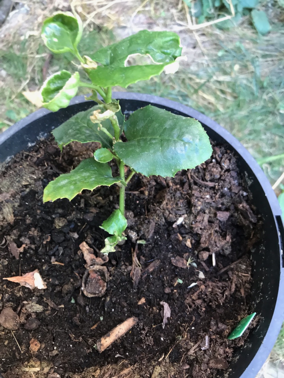 Voici un jeune plant de noisetier du Chili (Gevuina-avellana) acquis auprès de la pépinière Arven.