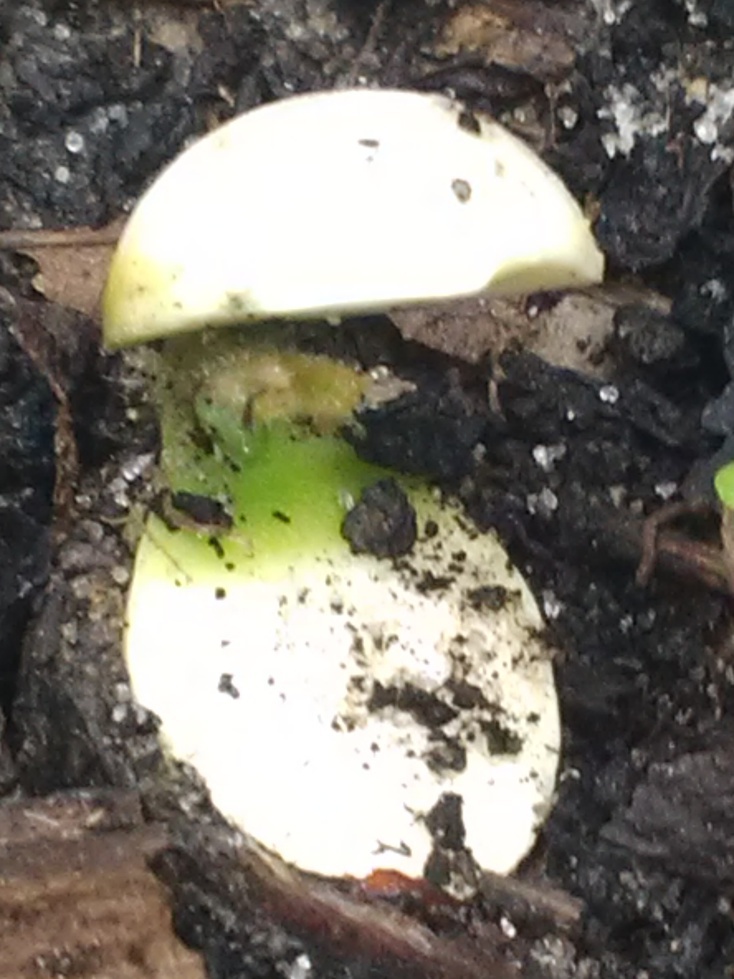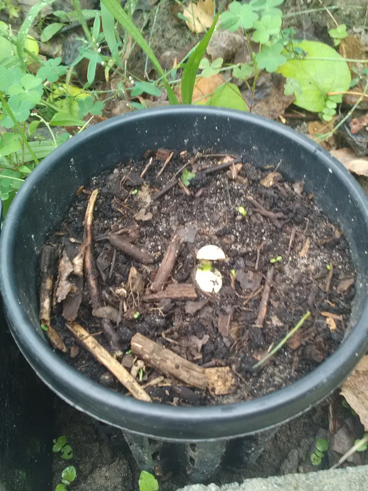 La première graine de gevuina montre une germination réussie. Temps de germination d'à peu près un mois à température ambiante. Substrat constitué d'une part de compost pour une demi part de terre de jardin additionnée d'un peu de broyat de bois plus ou moins décomposé.