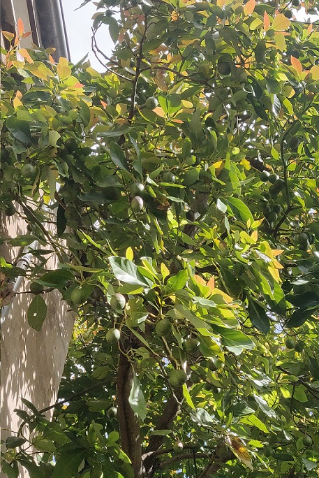 combien de fruits: une estimation a une grande marge de subjectivité, et aussi, peut-être en juillet lors du passage de benoit étaient ils déjà en partie récoltés, elle dit à partir d'avril ils sont meilleurs qu'avant. a ce propos les 2 fou3 fruits verts que j'ai cueillis en novembre immatures, sont déjà mûrs et mangés! après cueillette ça murit vite! et sont effectivement moins gouteux qu'à maturité. moins de matière grasse. surprenant: ce cru "2021" est différent du cru "2020"! ils s'annoncent plus gros et moins nombreux selon la propriétaire, mais ce qui m'étonne, ils ont une peau assez épaisse pour etre décollée, contrairement aux 3 derniers du cru 2020, que j'ai préféré éplucher en rasant la peau comme celle d'une pomme, trouvant la peau amère; (je n'indique ici que l'année de maturité, la formation débute l'année précédente).