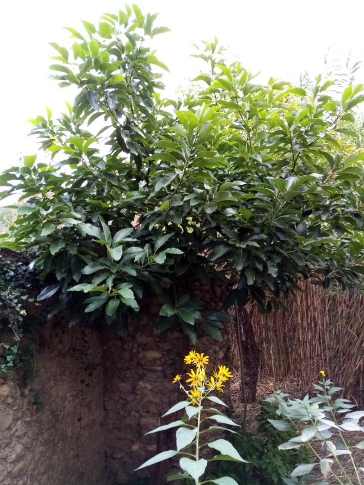 L'avocatier n°1 , haut + de 6m et large + de 8M, a des feuilles légèrement anisées et des fruits à peau lisse. était planté "il y a 40 ans". Par Madame, qui s'amusait avec des allumettes à faire germer des graines du commerce, d'origine israel pense-t-elle. puis elle les mettait en pots sur sa terrasse, les laissait dehors en hiver, certains mourraient. Elle a planté un survivant dans un jardinet, ancien poulailler, très proche (50 cm) d'un mur en pierres qui retient toute la terre surplombant une ruelle. ce mur n'a pas été détruit par la pousse des racines. il est bien protégé entre 2 maisons et une chaufferie. il y a quelques années, seules les extrémités des branches les plus hautes ont peu grillé (sur une longueur de 30 à 50 cm, on les voit encore). et il continue à bien pousser.