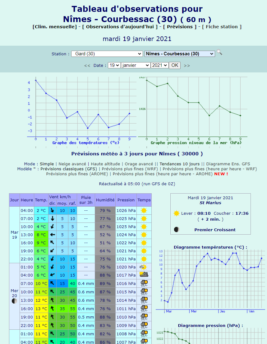 Ce qui est frappant c'est que le modèle de prévision météo GFS édité à 5:00 annonce 2°C à 4:00, alors que les observations de 0°C à ce moment là. Du coup au plus froid de la matinée on constate un écart de 5°C entre les prévisions et l'observation.