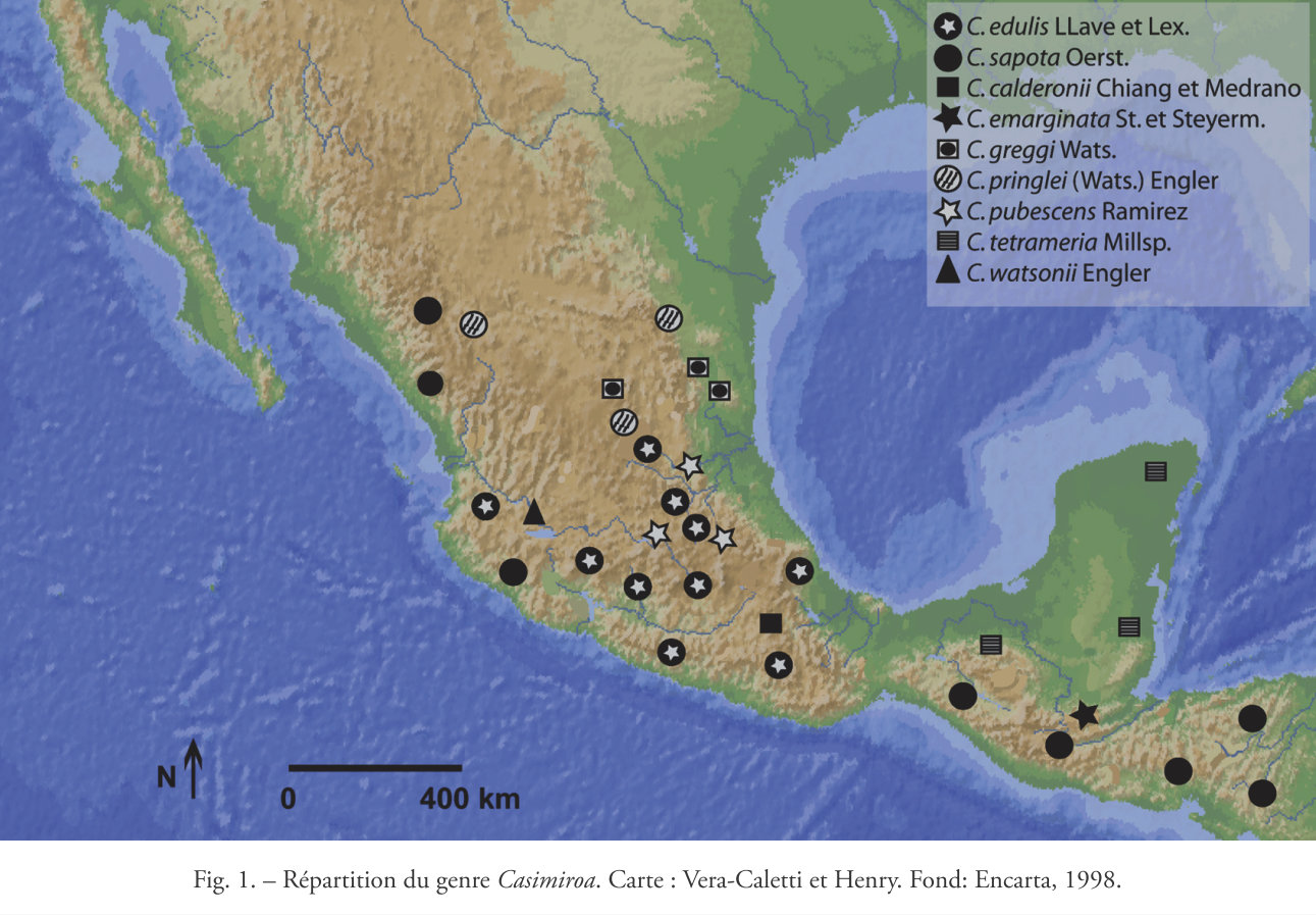 Sur les différentes espèces de casimiroa, une etude avec notamment une carte localisant les espèces et un zoom sur C edulis vs C. Sapota, 2 espèces très proches.
