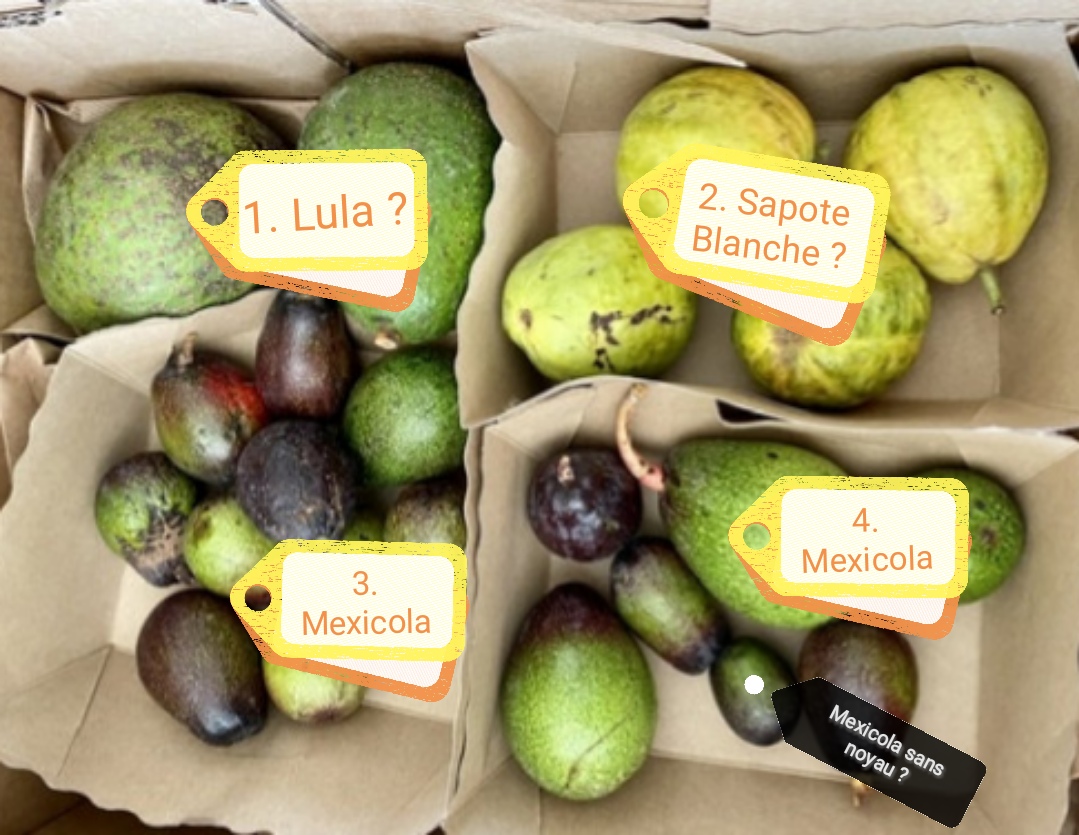 Ce sont bien des mexicola, excepté les deux Lula. Je suis intrigué par les fruits de la barquette en haut à droite. S'agit il de Sapote blanche ou de goyave ? Le pédoncule fait penser à la goyave...