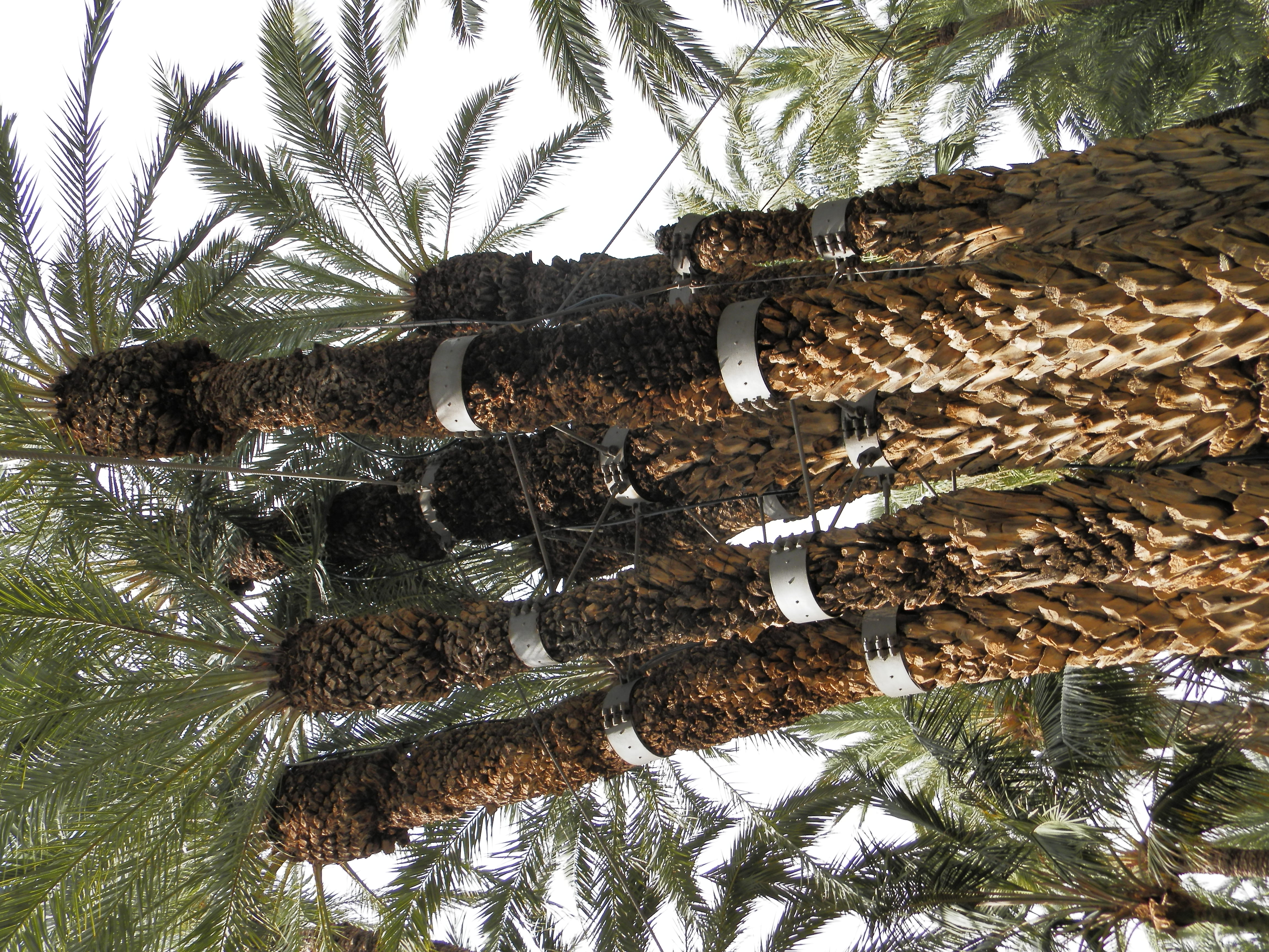 Habituellement, les rejets des palmiers apparaissent à la base du tronc principal au bout de 10 ou 15 ans. Dans le cas du palmier impérial, ces rejets sont non seulement nés lorsque l’arbre était âgé de plus de 60 ans, mais également à une hauteur peu commune de 1m50. Ainsi, le tronc principal continue d’alimenter les bras toujours en vie comme il l’a fait par le passé, assurant une croissance continue et homogène au fil du temps. Ce formidable candélabre à 8 branches pèse désormais plus de 10 tonnes et nécessite un carcans métallique permanent pour le soutenir.