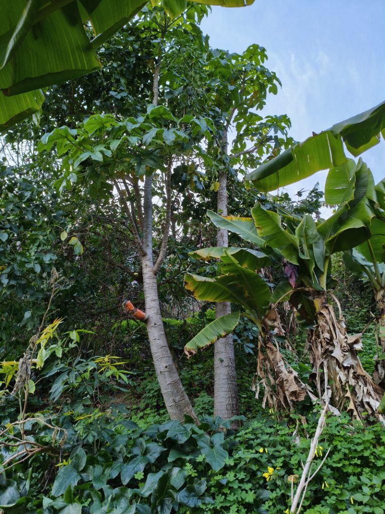 Mais au milieu des bananiers, il y a deux splendides papayers de Montagne. A ma connaissance ceux sont les plus gros papayers en pleine terre sans protection en France (à vérifier, car sur le groupe acclimatons j’apprends que dans le 66, il y en aurait des plus grands et surtout de vrais Carrica papaya) ? Ils sont situés sur la crête d’une montagne mentonnaise et admirent la méditerranée ! L’hiver ne leur fait donc pas peur car ils sont assez vieux.