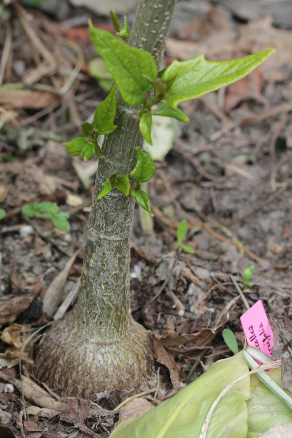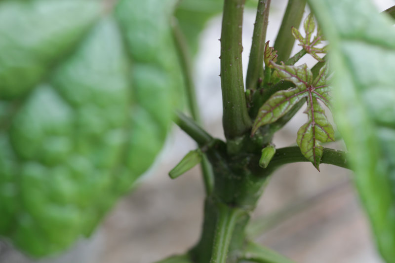 Le papayer à feuille de chêne a perdu ses feuilles en hiver mais en fait de nouvelles fines et brunes. Il semble vouloir produire des branches, ce qui le différencie des autres papayers qui ramifient rarement.