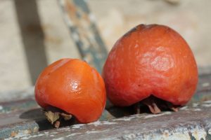Je suis arrivé chez Henri dimanche, lors de la cueillette de Kaki. Je ne pouvais pas mieux tomber, les fruits bien orangés était à point ! Henri a deux variétés : le Fuyu et le Géant Fuyu. Il s’agit de deux “kaki pomme”. Ce terme désigne les kaki dont la chair même ferme n’est pas astringente. Il est possible de les consommer croquants ou bien lorsque la chair est fondante. C’est d’ailleurs dans cet état que je les préfère. Le calibre du Géant Fuyu – comme son nom l’indique – est important et certains fruits récoltés affichent 450 gr sur la balance. Le Fuyu “classique” pèse généralement 150 gr. Quelques fruits du Géant Fuyu comptent quelques grosses graines.