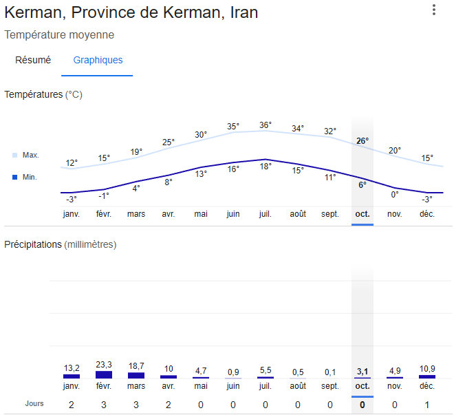 Les températures sont plus chaudes qu’à Nîmes l’été (pour les maxima) et plus froides en hiver (pour les minima) ! La région de Kerman cultive la pistache depuis des millénaires. Une variété a pris le nom de la région, elle est très répandue à travers le monde. L’arbre femelle est rustique et produit une noix de bonne taille.