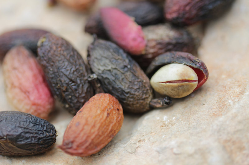 Généralement, je cueille les premières pistaches qui s’entrouvrent fin août. Cette année, elles ont bien du mal : la coquille a noircit et sèche autour de la noix. Toutefois quand j’enlève la bogue, la coque blanche est un peu ouverte. L’amandon vert a une saveur de noisette fraîche et un arrière gout typique de la pistache. Un petit délice ! J’en ai une douzaine.