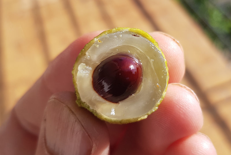Je déguste le tout premier longan du jardin. L’arbre greffé a passé un hiver sans protection et a fleurit en juin. Les fruits sont murs fin octobre ! Verdict : délicieux ! Tout aussi bon qu’un fruit du commerce, voir meilleur car plus fruité. C’est un peu plus sec et caoutchouteux qu’un litchi. J’adore ! L’arbre n’est pas bien grand (env. 50 cm) et semble bien mieux se comporter que les litchi avec lesquels je n’ai eu que des essais infructueux !