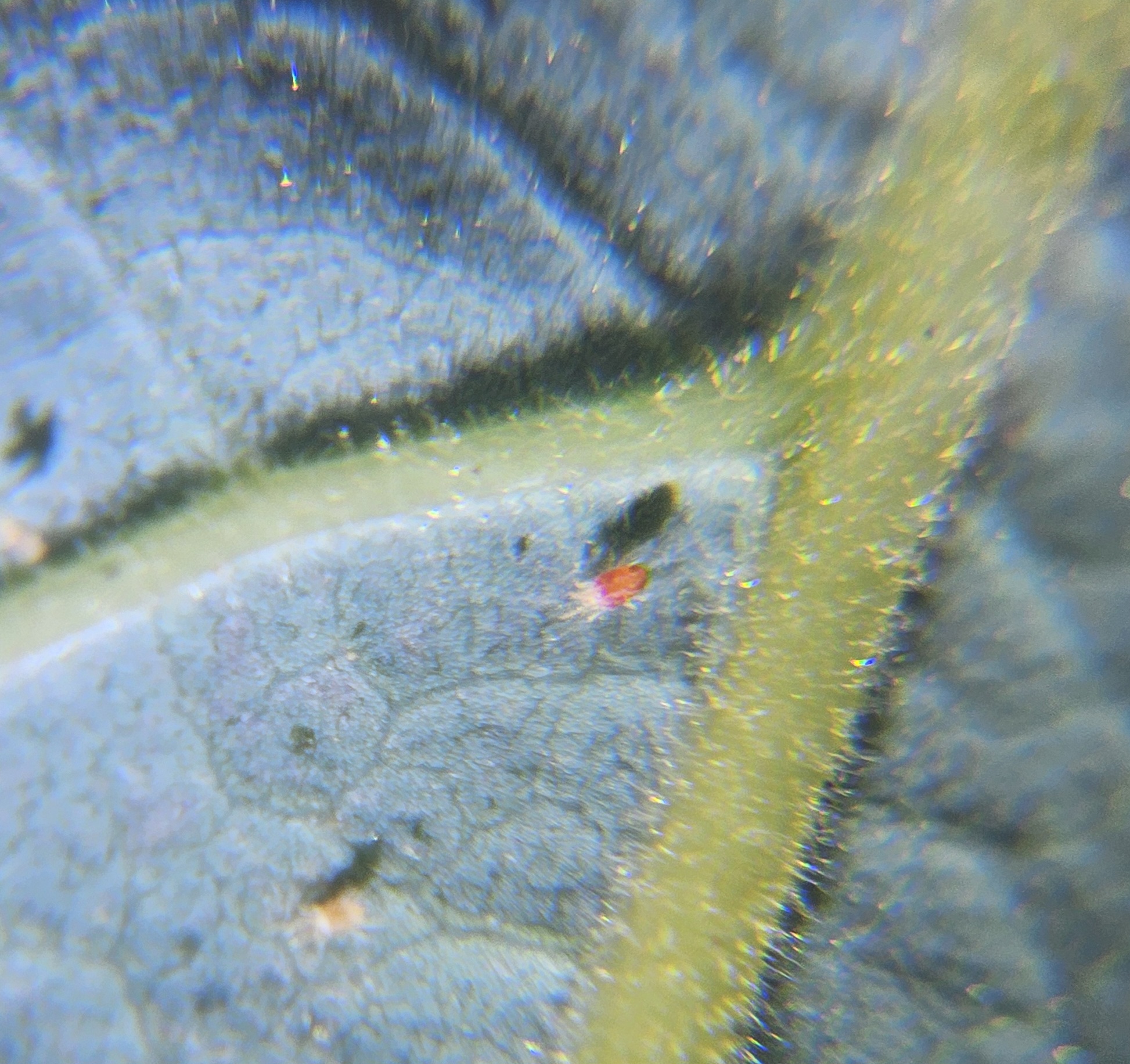 En regardant avec une loupe, je vois des acariens rouges sous les feuilles.
